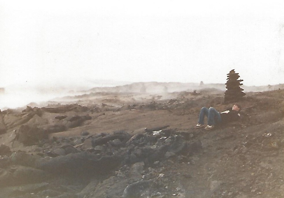We were crouching next to a 2 foot pyramid of sharp black stones on the crunchy black gravel which surrounded us. The monochromatic moonscape stretched as far as the eye could see in each direction. John and I remained in this odd pose and peered across the dark jagged horizon in order to spot the next ahu or cairn like this one, which would define the next transect we needed to walk to safely guide us through this treacherous field. To deviate from the trail could end badly. This was Hawaii Volcanoes National Park in 1984 and the sharp rock we picked our way across was basalt Aa lava. To stray from the transect could result in a fall into a lava tube so we painstakingly and diligently searched for the closest ahu, but they were hard to distinguish, one from another, each jet black ahu from the jet black groundmass.