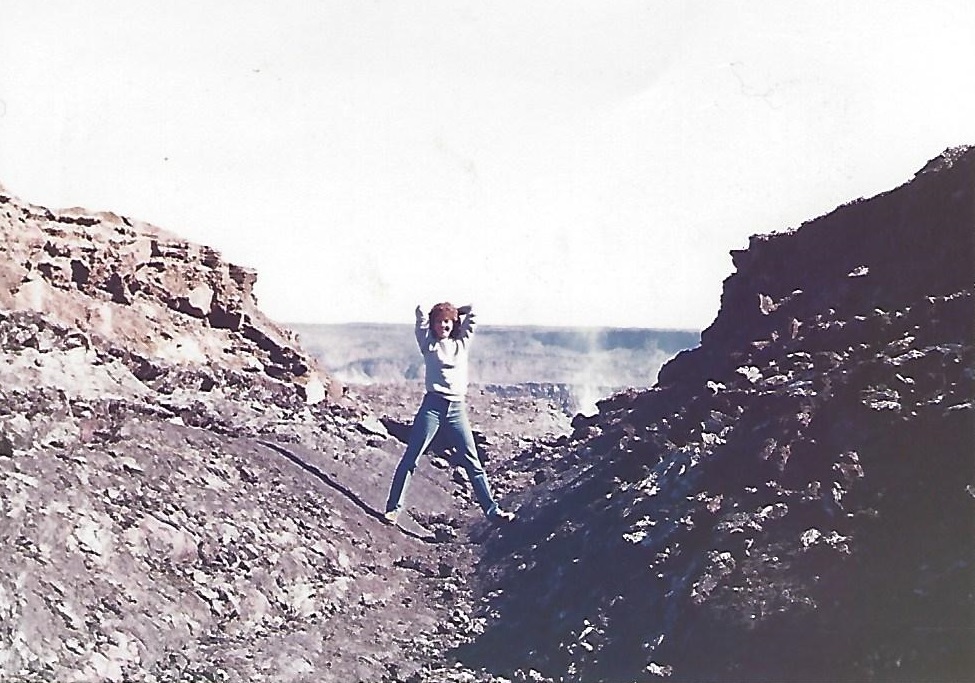A few euphoric hours were passed up there before folks had to decide the next course of action. Dusk was approaching. Plans were made. Some of the party remained, and the rest of us scurried down the ancient vent and scrabbled out of the jagged lava flows to our vehicles in record time, I know not how. There was a second wind in this group of newfound friends. We agreed to meet again after dark at the lookout on the cinder cone. John and I made a stop at the mess hall for a hasty half-eaten dinner, a dash into our cabin for our jackets and a blanket, then the all-important convenience store for flashlights, batteries, bread, wine & cheese; enough to share. And we were off for the rendezvous. We knew our way now – this was familiar land. Crazy red flares in the sky lit the way and lit our hearts. We felt privileged to bear witness to Pele’s power throughout the night. Transfixed by the primal rumble and the glow of middle earth we attended the best. party. ever. on Pu’u Huluhulu as Pu’u ‘O began the long-lived eruption that earned her the new name, the name you now know, Pu’u’ ‘O’O (enduring, enduring). That night, with the incandescence of all her liquid, magmatic fury, Pu’u’ ‘O’O had solidified my decision to be a geologist.