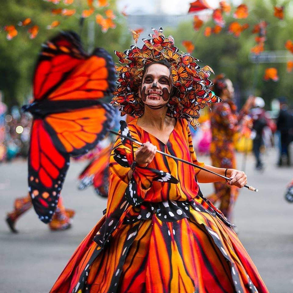 In Mexico, people have long revered the return of the monarch butterflies, the endless flowing orange cloud that arrives over the mountains at the same time every year. This event coincides with Dia de los Muertos celebrations, from October 31st to November 2nd. The monarchs hold a spiritual and cultural significance for the Mexican people, having come to be regarded as the souls of departed ancestors returning to Earth for their annual visit. During the celebrations and parades associated with Dia de los Muertos, many people dress in attire to honor monarch butterflies and the end of their 3,000 mile journey.