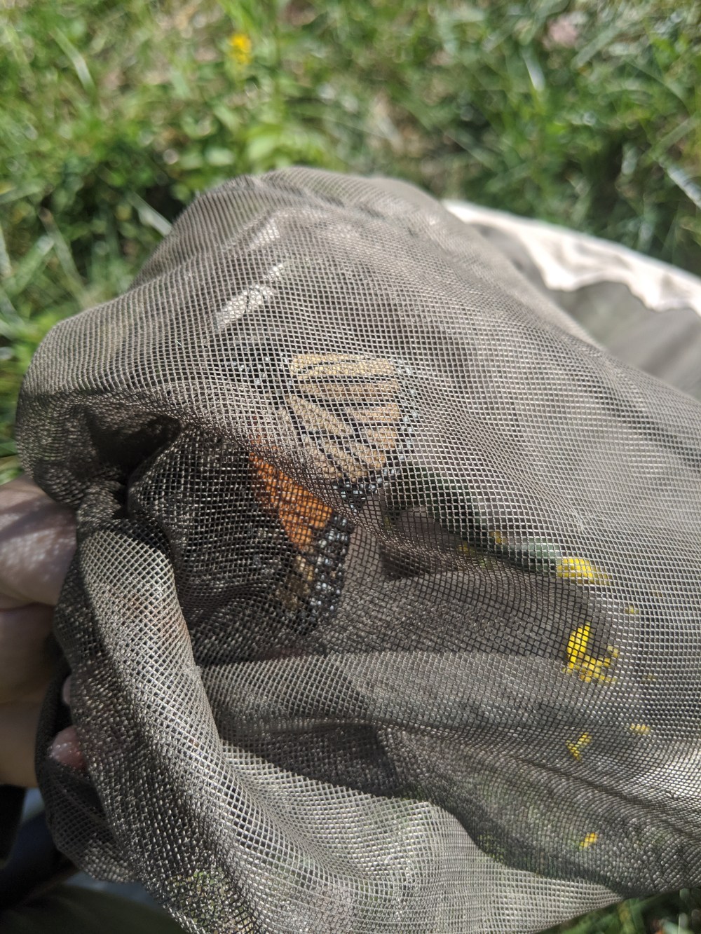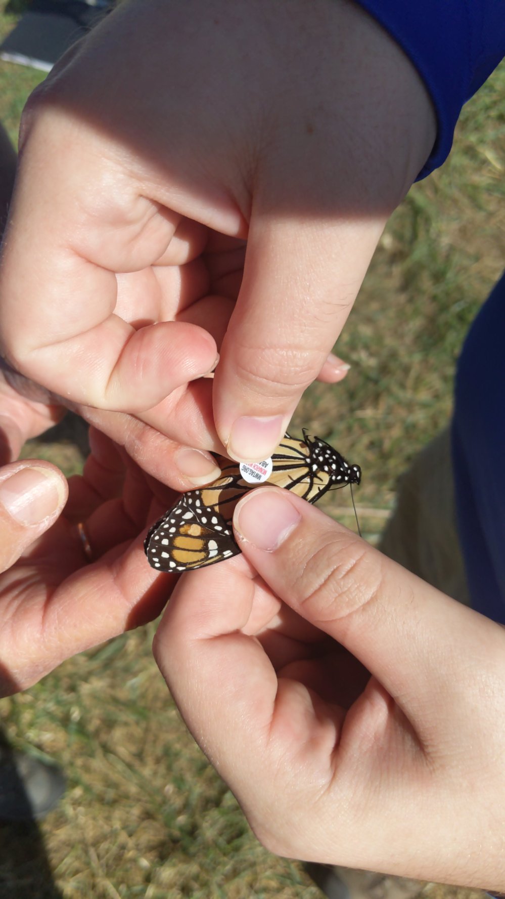 Step three: Tagging. After reporting to the designated checkpoint and verifying that we had indeed captured a monarch, data collection began. This process is fairly quick. It starts with learning how to safely handle the butterfly. I was quite surprised to learn that butterflies are held at a particular place on their wings for the tagging process. These fragile-looking wings are built for a 3000 mile migration, so it makes sense that holding them properly for a few seconds wouldn’t hurt. After making sure I had a proper hold, I was given a circular sticker about the diameter of a pencil eraser to place on the wing.